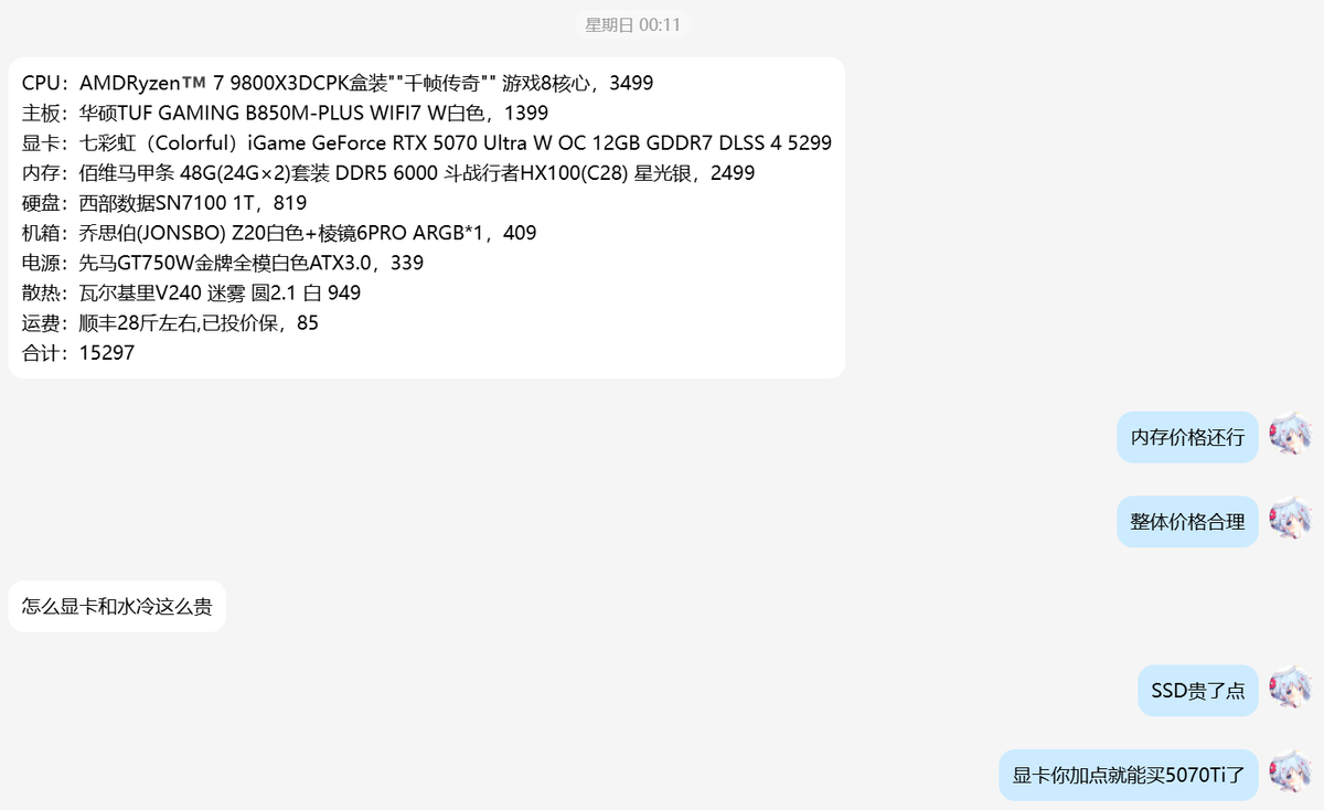 但是这个双12感觉也是最后的装机窗口了,因为内存涨价的原因,明年这些存储产品可能都要继续维持高价到2027,所以说要装也不是不行。直到他发给我配置单,我一看,好家伙,1w5只能上个5070,这么离谱?而且还是垃圾电源。问了下公众号店铺这边的价格,也便宜不了太多……