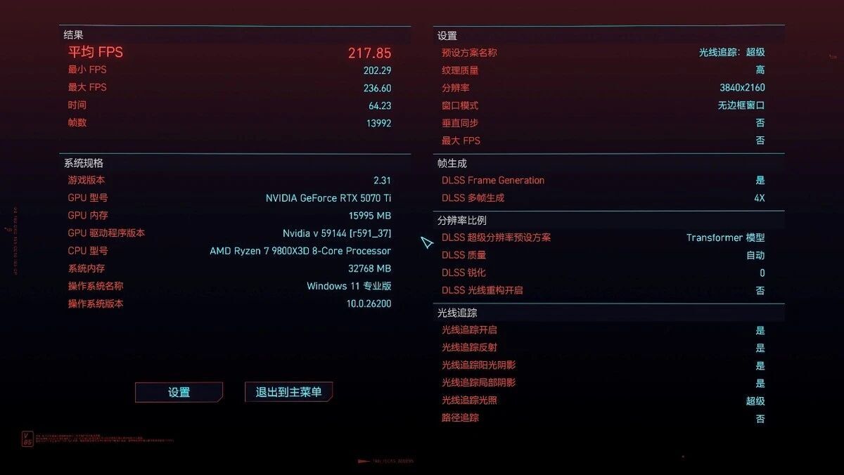 2077,光追超级画质,开启4倍帧生成,平均217帧,爽玩没问题。