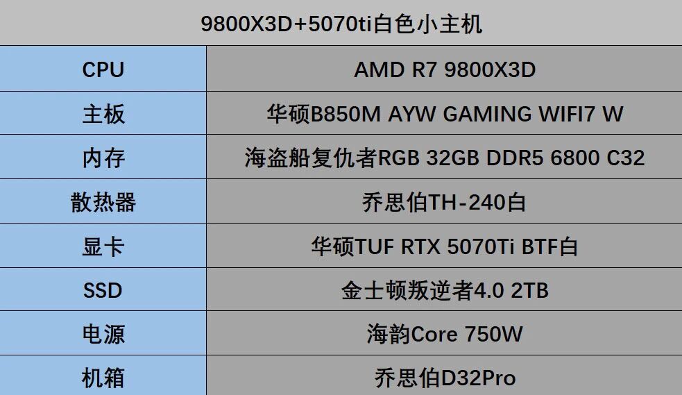 机器配置如下,内存其实是48G,因为这套32G朋友那边寄过来快两个月了我还没动工,所以正好趁着这个机会装一下看看效果吧,拍完照会换上金邦的48GB DDR5 7200套条。主板是之前开箱过的B850M AYW白色,搭配之前买的TUF 5070Ti BTF白,也算是个华硕半家桶了。而且98X3D+5070ti的游戏性能,只要不折腾,5年感觉都不用动了。SSD是金士顿的叛逆者2T,它还有个名字叫KC3000,虽然不是一个SKU,但是本质上是一个方案出来的。电源的话,750W的海韵纯白电源,带这套配置是足够的。整体看下来,这不是比买那套5070的配置强多了!