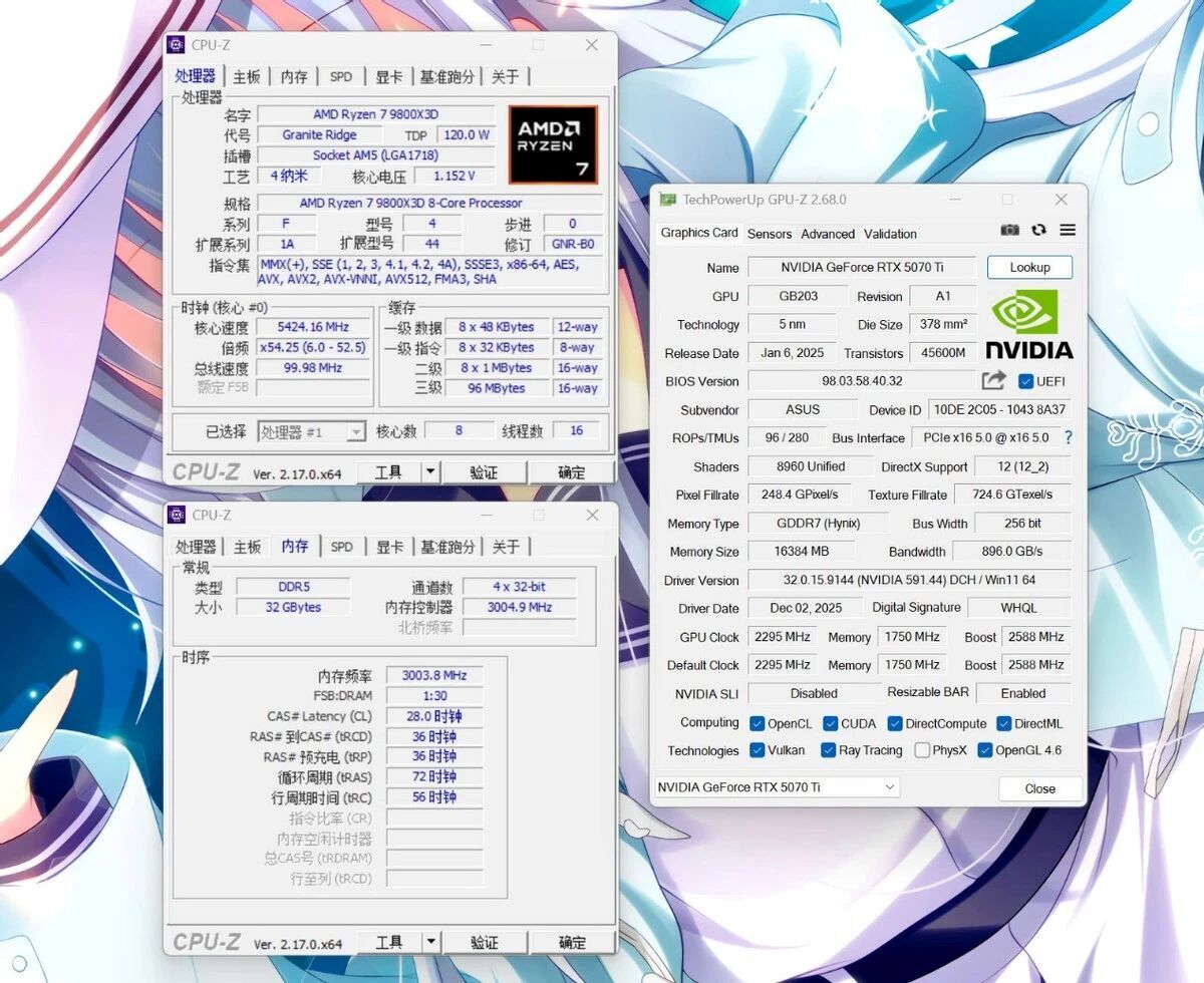 最后简单跑个分吧。机器信息如下,9800X3D+5070Ti,内存我手动调成了6000C28的时序,这样可以获得更好的游戏效果。机器的驱动以及BIOS都已经更新到了最新。