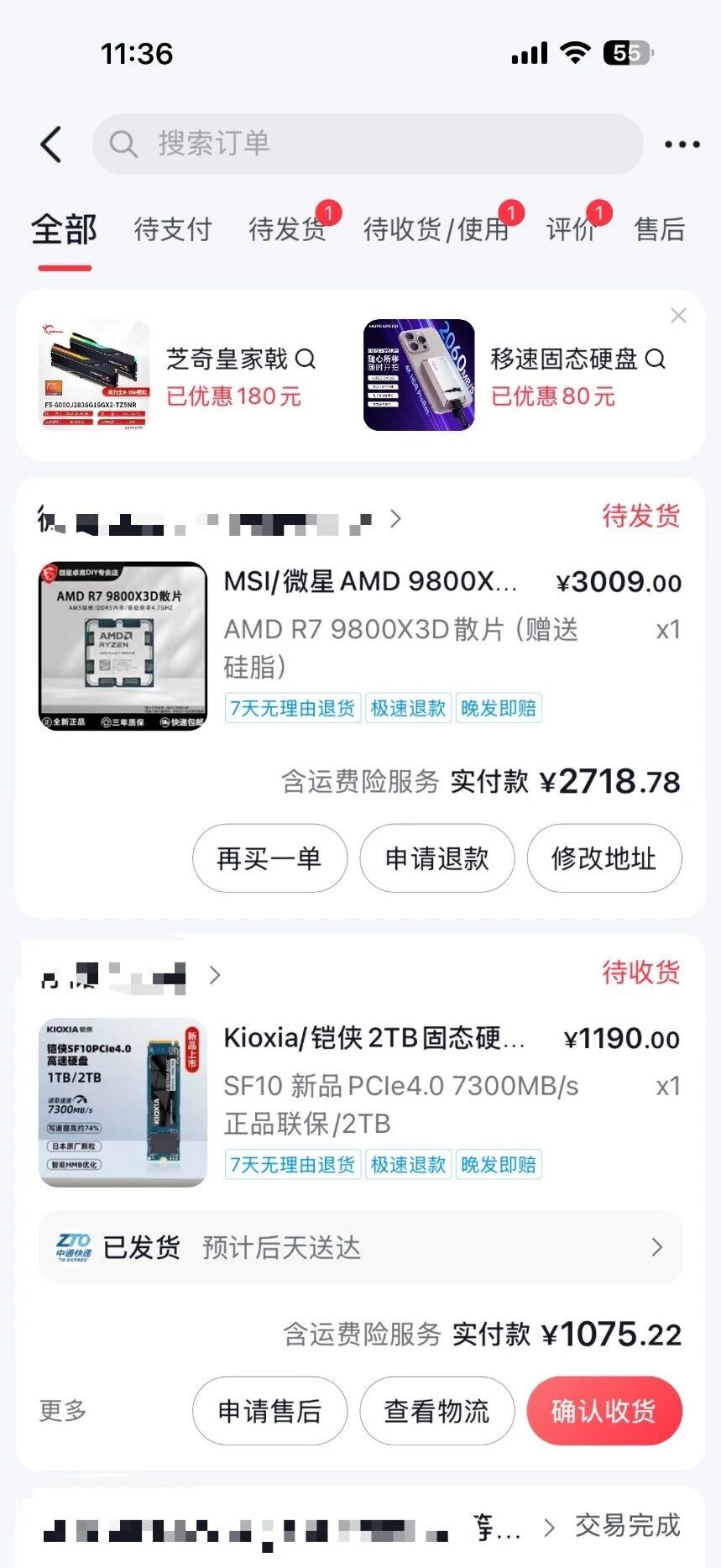 于是乎,最后我盘了一下手上的东西,发现只要买一个水冷和一个CPU,就可以凑齐一套机器了。于是乎趁着双12,我在音符上下单买了98X3D,凑单了一条SSD。因为我给他的就只有一条2T的金士顿叛逆者2T,虽然是4.0的旗舰盘,但是小了点,再凑一条2T应该就够用了。毕竟CP这么多年也送了我不少东西,包括ipad pro 2021,app2,apple watch啥的,每年的生日蛋糕等等。所以说,这忙我该帮。