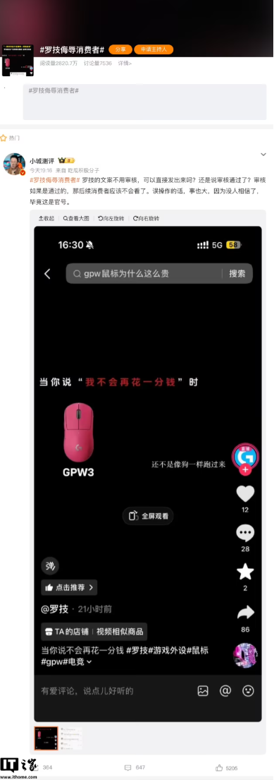 3 月 26 日消息,3 月 26 日,罗技官方账号通过短视频平台发布鼠标宣传推广视频,配文出现“我一降价,还不是像狗一样跑过来”的文案,引发众怒,“罗技侮辱消费者”有关话题一度于今晚 21 时 11 分登顶微博热搜。