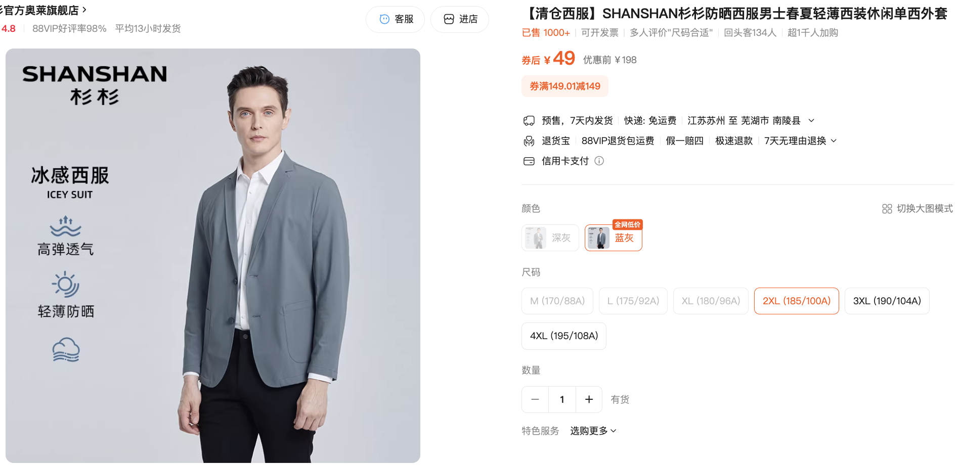 杉杉西服外套清仓,49元一件,只剩下蓝灰色了。