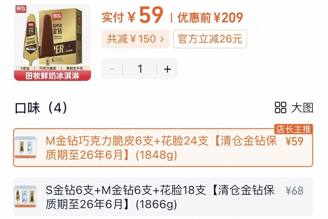 ㉑. 田牧 金钻巧克力脆皮*6支+花脸冰淇淋24支