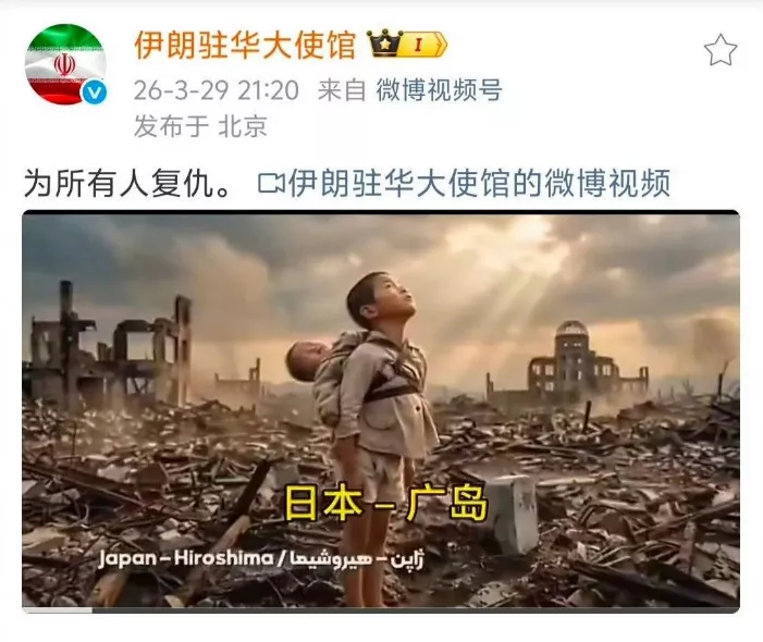 伊朗驻中国大使馆微博所上传的影片中,出现日本广岛、美洲原住民、越南、也门、巴勒斯坦-加萨、艾泼斯坦岛、伊朗最高领袖哈梅内伊的AI生成片段,伊朗指称要为上述“所有人复仇”。 对于伊朗要替日本复仇一事,大量中国民众感到相当崩溃,纷纷留言痛骂“哭错坟了老弟”,还有人认为这代表伊朗根本不尊重中国,和中方就是单纯的贸易往来罢了。 https://x.com/i/status/2036...