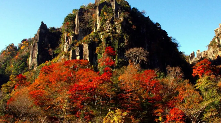 位于大分县中津市的「耶马溪」同时拥有「日本新三景」、「日本遗产」和「日本三大奇景」的美誉。在这里能看到色彩绚烂的枫叶与岩峰群交相辉映的绝佳景色。
