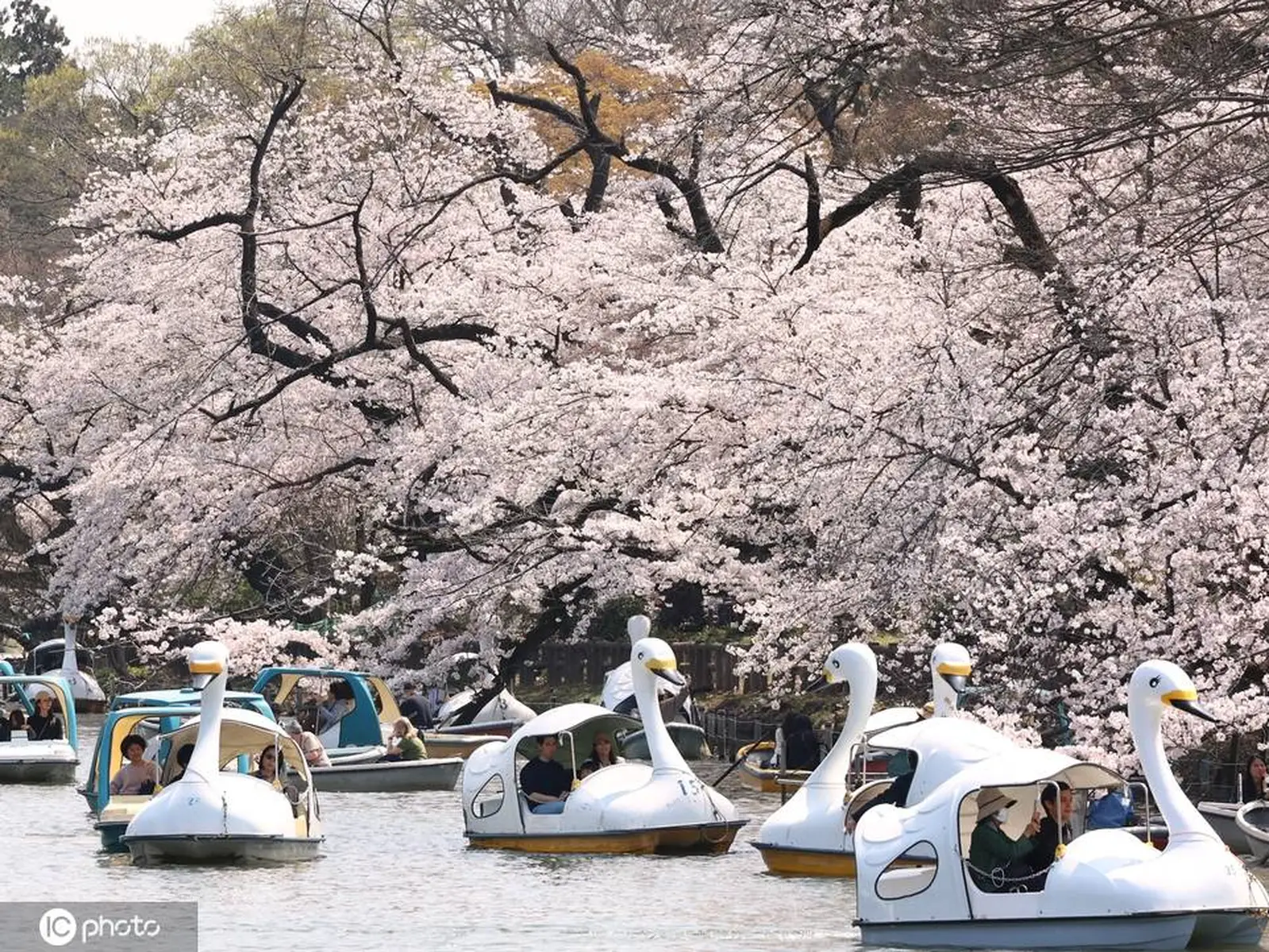 2026年3月29日,日本东京,民众在东京井之头公园盛开的樱花下乘天鹅船和划船游玩。