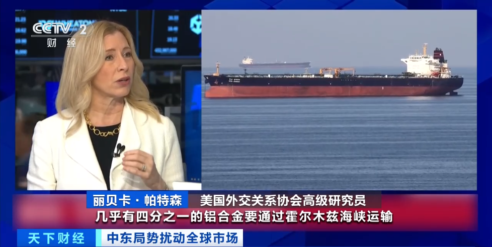 美国外交关系协会高级研究员 丽贝卡·帕特森:我之前没有意识到,几乎有四分之一的铝合金要通过霍尔木兹海峡运输,这对汽车制造行业来说是一个巨大的供应链风险,再比如冷饮用的易拉罐、飞机机身等,都会受到影响。