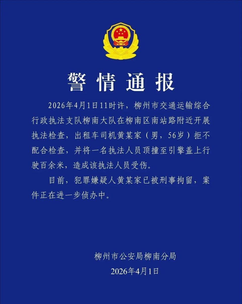 2026年4月1日11时许,柳州市交通运输综合行政执法支队柳南大队在柳南区南站路附近开展执法检查,出租车司机黄某家(男,56岁)拒不配合检查,并将一名执法人员顶撞至引擎盖上行驶百余米,造成该执法人员受伤。目前,犯罪嫌疑人黄某家已被刑事拘留,案件正在进一步侦办中。