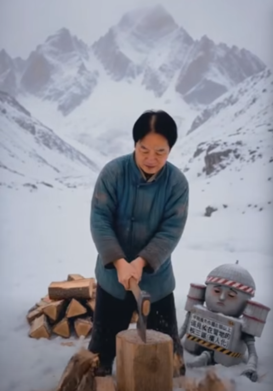 视频中,赖清德在雪山上砍柴,身旁雪地里的“核三厂” 说:“唉呀,这不是一个人在冰天雪地里发抖,您的反应炉都快熄火了?”赖清德说:“别怕,我这儿有干净的煤,拿去取暖吧。”画面一转,赖清德在屋子里砍柴,一个女子走进屋子,询问道:“你是否在雪山救过一座核三厂?” 赖清德问:“你是当年那座核三厂?” 女子回答称:“不!”赖清德又问:“还是当年那一堆干净的煤?” 女子回答称:“不!我是当年被你丢在美国的燃料棒。”说着,女子变身美国军机向赖清德复仇。