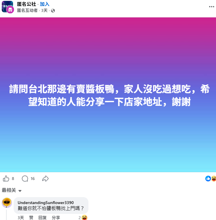“你可曾在雪山救过一只狐狸?”这句话也飘到了台湾。近日,不少台湾媒体都在“普及”“雪山救狐”是什么梗,甚至称其为2026最红AI武侠迷因(网络爆红事物)。据台湾热门话题分析网站“网络温度计”统计,近一个月“酱板鸭”的相关讨论量近万。有网友表示,“我大概看过30个版本,真心建议不要看,因为一看就只想继续看还有没有更扯的版本”。 还有台湾网友表示,玩梗玩着玩着就馋了,“看完想吃酱板鸭是正常的吗?”甚至台湾社交媒体上已经出现匿名互动的帖子,“请问台北那边有卖酱板鸭,家人没吃过想吃,希望知道的人能分享一下店家地址,谢谢。”