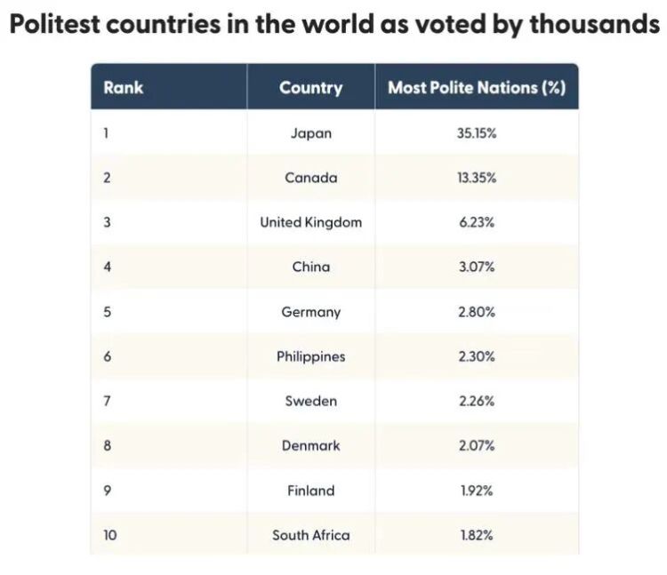 结果,日本以 35.15% 的得票率,稳坐“全球最礼貌国家”头把交椅。