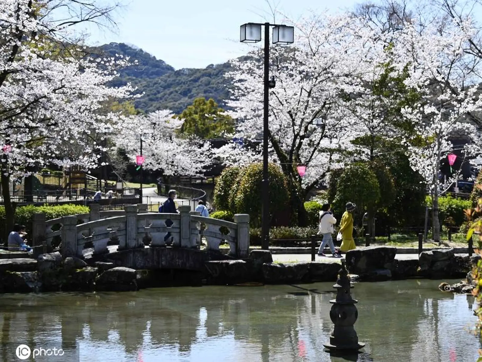 春意正浓,岐阜市的日中友好庭园里,樱花如云似雪,微风轻拂,粉白的花瓣簌簌飘落,铺就一条温柔的花径。