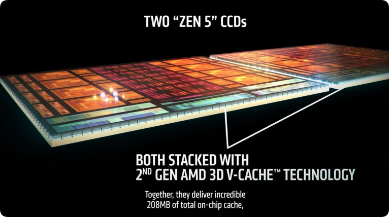 通过3D垂直缓存技术,为每个CCD带来额外的64MB SRAM缓存,使得处理器里单个CCD的L3缓存容量由32MB增加到96MB,容量增加到原来的三倍。由于双CCD都增加了L3缓存,意味着具备实现最强游戏性能的可能性,用户可以将游戏进程安排在任意一个CCD。