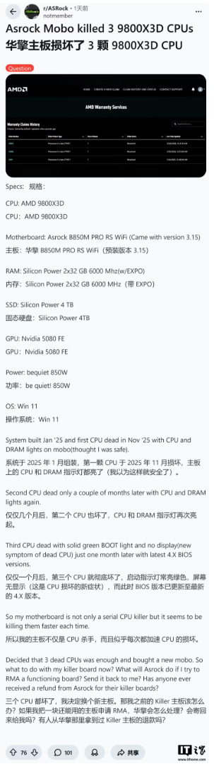 3 月 31 日消息,网友 u/notmember 于 3 月 29 日在 Reddit 社区发帖,反馈其遭遇极其罕见的硬件故障,其电脑主板在短短几个月内连续烧毁了 3 块 AMD Ryzen 7 9800X3D 处理器。