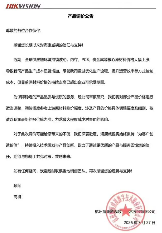 3 月 28 日消息,海康威视于 3 月 27 日向客户及合作伙伴发布《产品调价公告》,宣布将对部分产品价格进行调整。