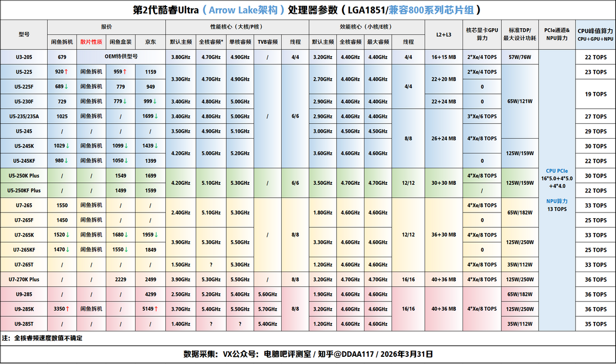 ☞ 目前游戏+生产力的全能型选手Ultra 7-265K盒装版的价格基本都在1800元附近(实际套装里面的盒装一般也就1300-1700元),散片建议去闲鱼上找准新的拆机片,闲鱼上的全新盒装版优惠力度也很大,265KF还要更便宜。因为功耗大幅降低,主板搭配普通B860就可以,散热器搭配普通六热管足够(100多块钱的利民BA120就完全够)。酷睿Ultra重点加强了AI计算能力,全系列所集成的NPU单元算力为13 TOPS。
