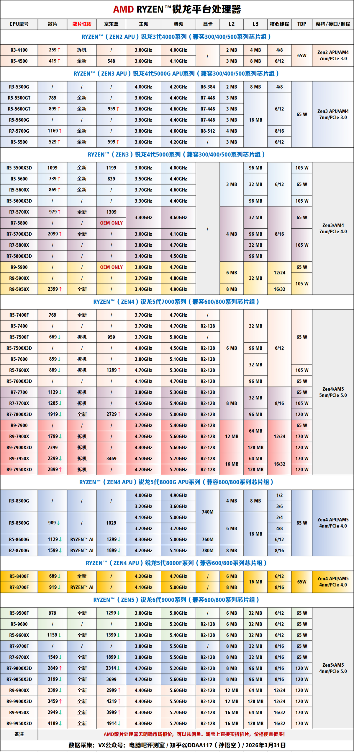☞ AMD处理器涨价趋势与英特尔相似,AM4平台小涨,AM5平台小跌,热门的X3D系列处理器小涨;全新的炒冷饭R5-5500X3D处理器上市,适合AM4平台FPS网游用户选择。其他配件方面,3月以来内存价格总体保持平稳,部分型号甚至已经开始下跌;SSD总体大涨,相比上月的涨幅超过10%;机械硬盘总体大涨,更建议4TB或更大容量起选,也可以花小钱买二手拆机500GB/2TB/3TB盘。