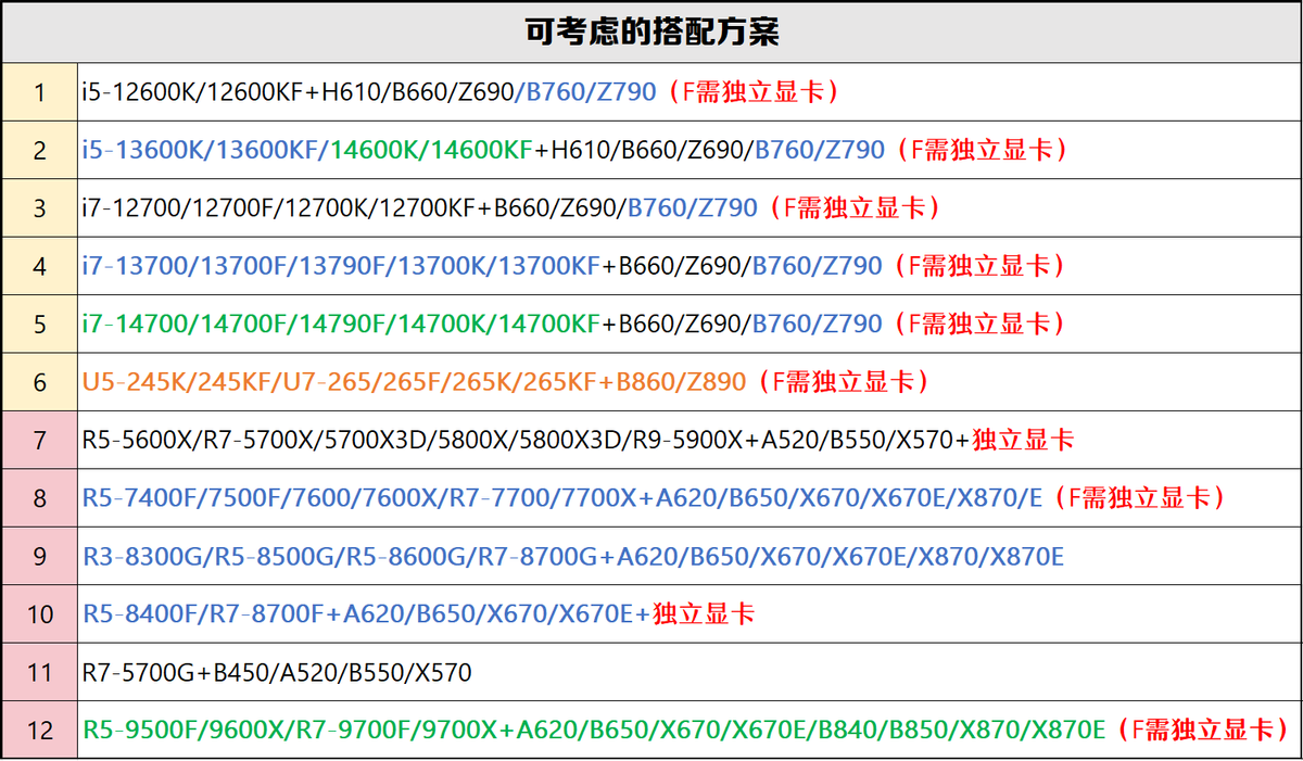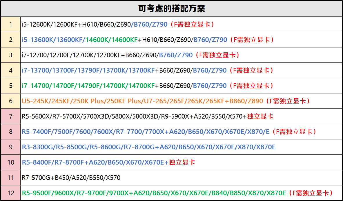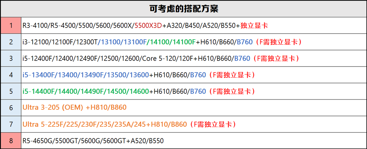 ☞ 主流梯队:12代i5-12400F(6核12线程)、13代i5-13400F(10核16线程)因为可以支持DDR4,仍具备一定的选购价值,内存建议搭配拆机DDR4(你搭配全新条子还不如直接上Ultra 5+DDR5),主板建议搭配H610或入门B760,散热器用普通2-4热管产品即可,显卡根据预算来搭配,最低可以配几十块钱的亮机卡(带核显的型号不划算)。新平台这边,Ultra 5-225F或230F虽然价格低廉,PDD上的套装促销力度更是空前,但DDR5的高价格让消费者望而却步,对比之下的综合成本可能不如“酷睿i5+拆机D4”实惠。现阶段建议Ultra 5-245KF的目标群体可以考虑入手新平台。这一价位酷睿Ultra的对应主板可搭配入门级H810或B860,CPU散热器选用普通塔式四热管产品即可。