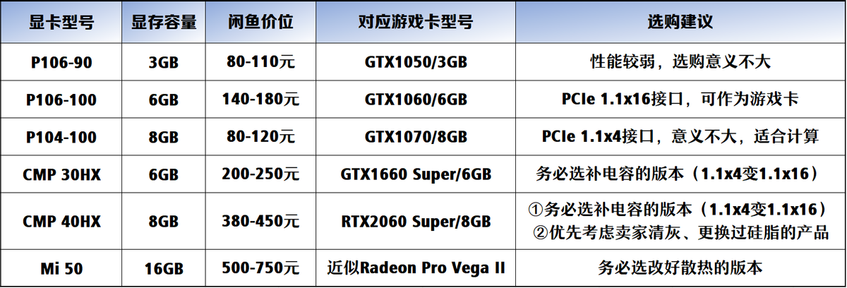 ☞ 你也可以选择闲鱼上150多块钱的P106-100矿卡,其性能近似GTX1060,或者CMP 30HX/40HX等产品。需要注意,绝大部分矿卡没有显示输出接口,需要依赖CPU的核芯显卡以及主板自带的显示输出接口负责显示信号的输出,并且需要搭配专用的驱动,不适合非常小白的玩家或者F系列CPU用户,具体也可以咨询相关卖家了解情况。