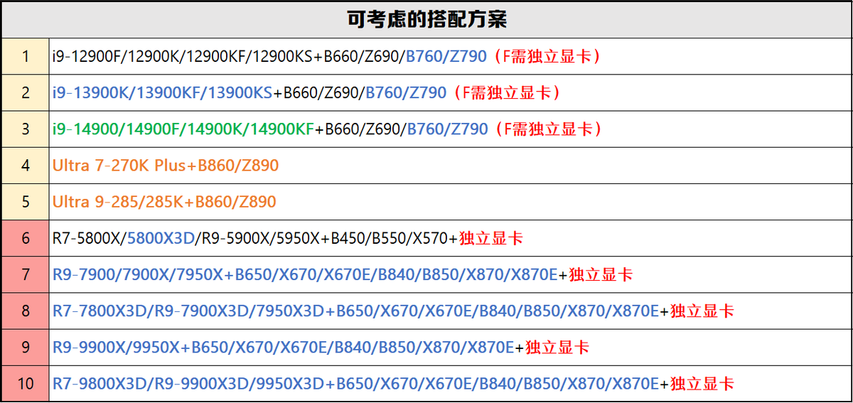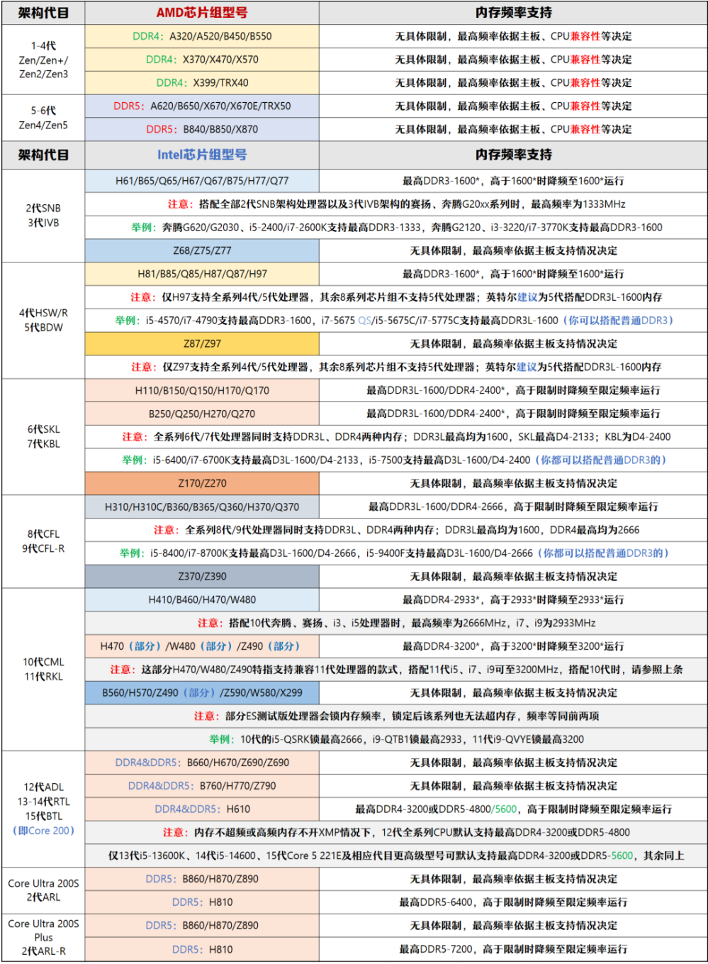 *特别提醒:AMD平台接口第三位的数字代表其所支持的内存,例如AM4接口就仅支持DDR4,AM5接口就仅支持DDR5,新平台请尽量搭配最新版本Windows 11使用,可以提高性能表现;酷睿Ultra 200S新处理器到手后请更新主板BIOS至最新版本,以便更好发挥CPU的性能。