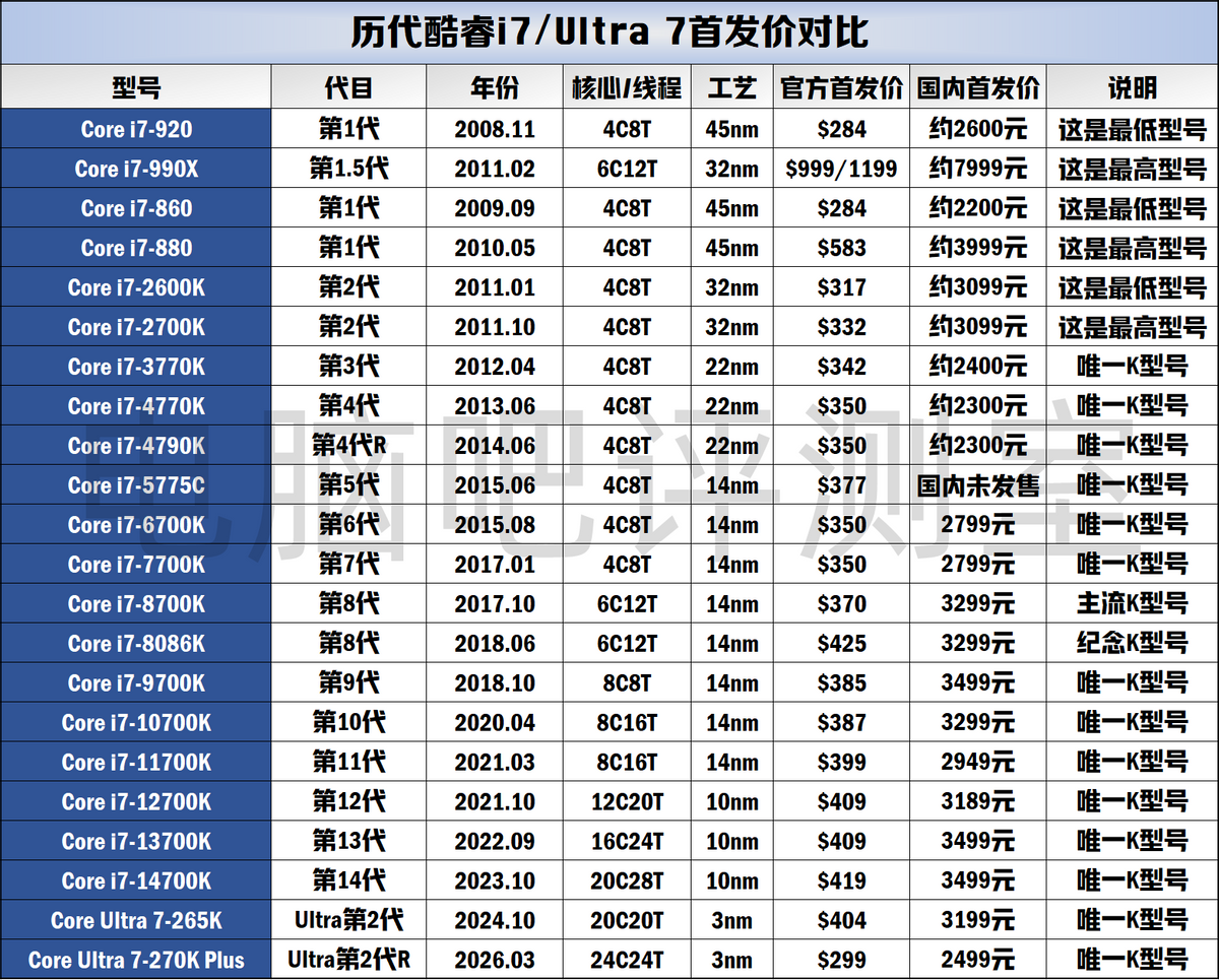 ☞ 英特尔酷睿Ultra 200S系列处理器采用台积电3nm制造工艺,在降低运行频率的同时还取消了超线程技术,但得益于P核、E核效能大幅提升,该系列处理器在“双减”的情况下综合性能依然提升且功耗大幅下降。目前酷睿Ultra性价比全面碾压酷睿i,缺点是只能搭配DDR5内存,追求低价格建议去闲鱼上买正式版拆机片。