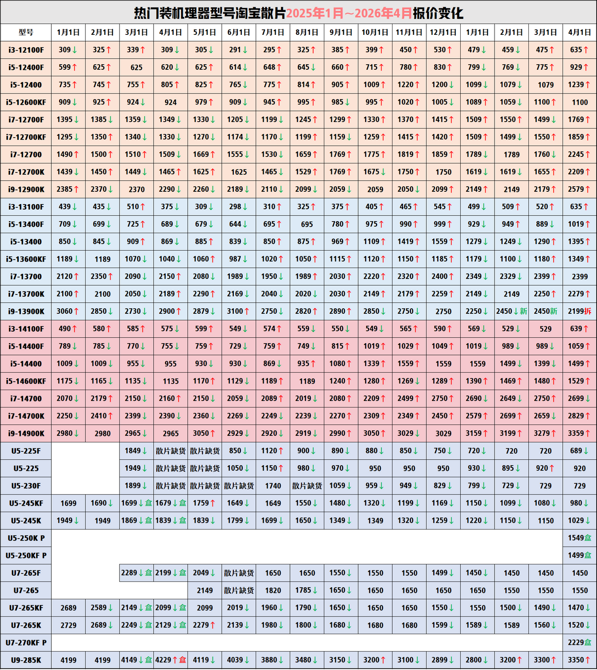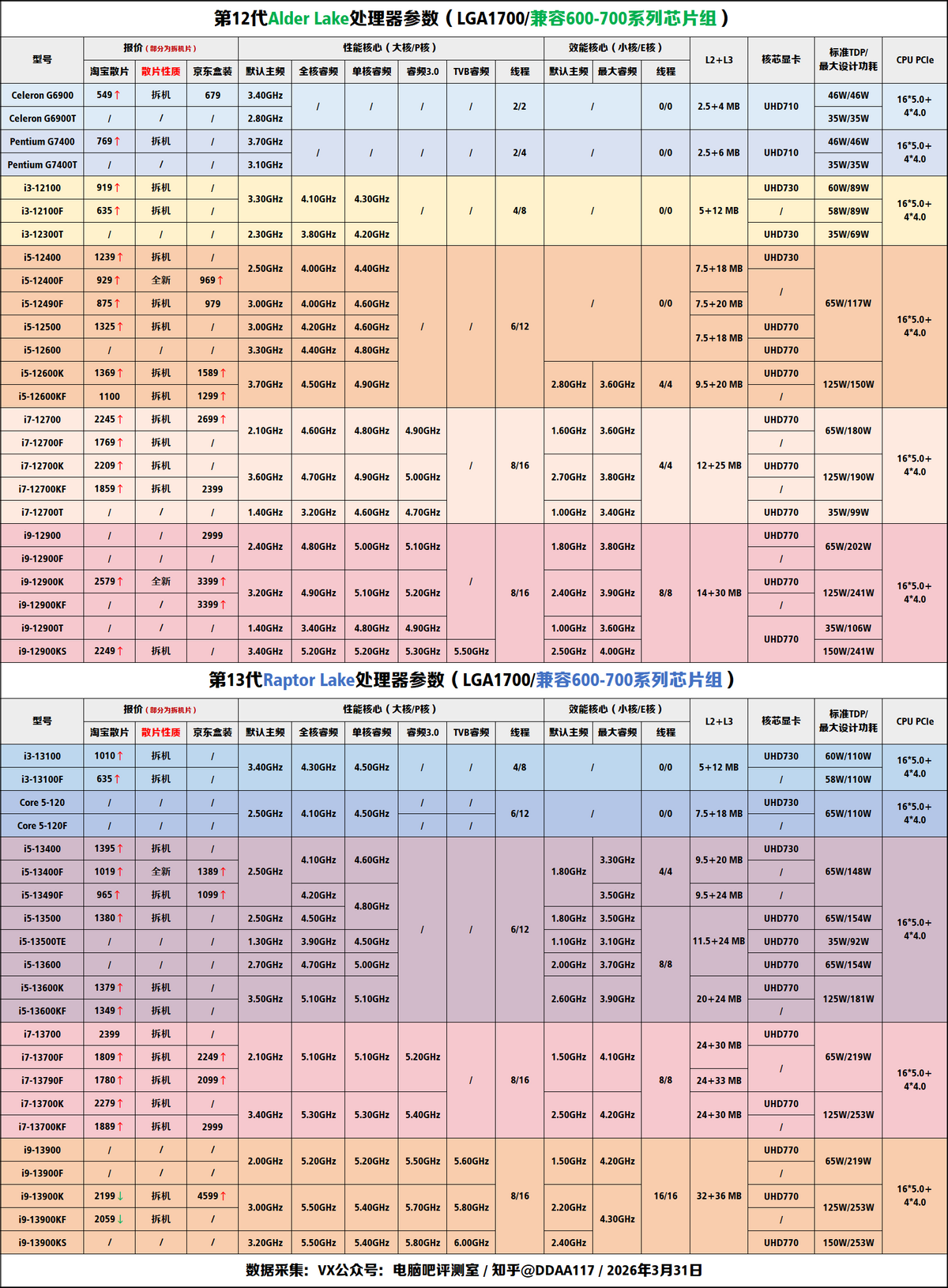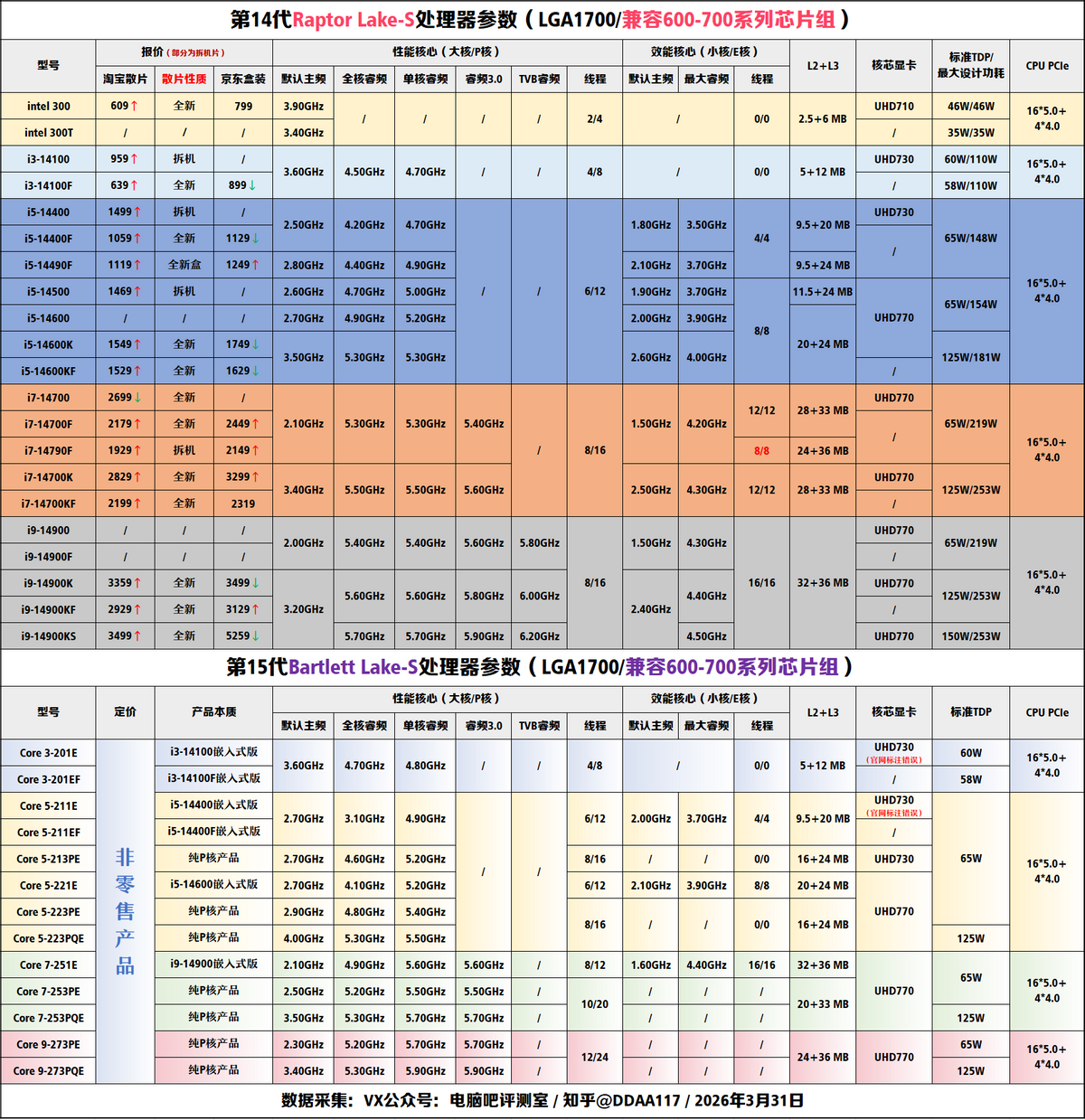 摘要:截至2026年3月,DDR5内存近半年涨幅已经超过300%,SSD 涨幅也超过200%,整机装机成本明显上升。基于Bartlett Lake架构设计(这个架构其实也是Alder Lake和Raptor Lake的马甲,但仅面向嵌入式系统和边缘计算),因为英特尔之前告知酷睿i最多只有14代,所以之后的马甲只能重新命名,并改叫“酷睿”系列,就是简单粗暴把i去掉,目前已经推出100、200两代产品(注意和酷睿Ultra 200区分开),没有选购价值,纯纯图个新鲜。 ☞ AMD中高端显卡的热度较低,像RX9070XT(性能接近RTX5070Ti)、RX9070(性能优于RTX5070)选择的消费者都不多,且后者逐渐由RX9070 GRE取代,消费者一般就是在RX9070 GRE和RX9070XT两款之间挑选。