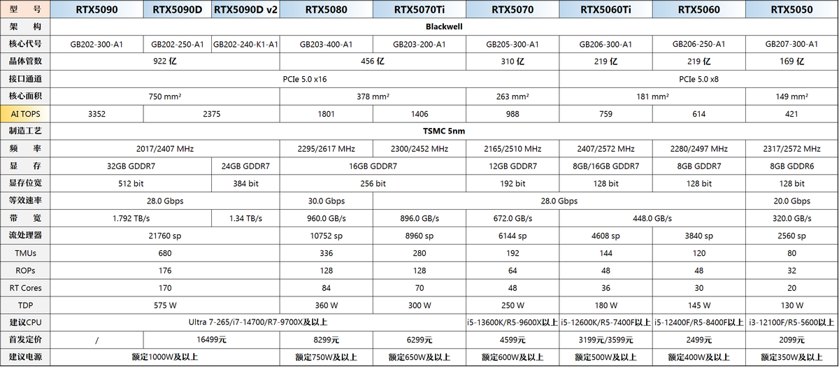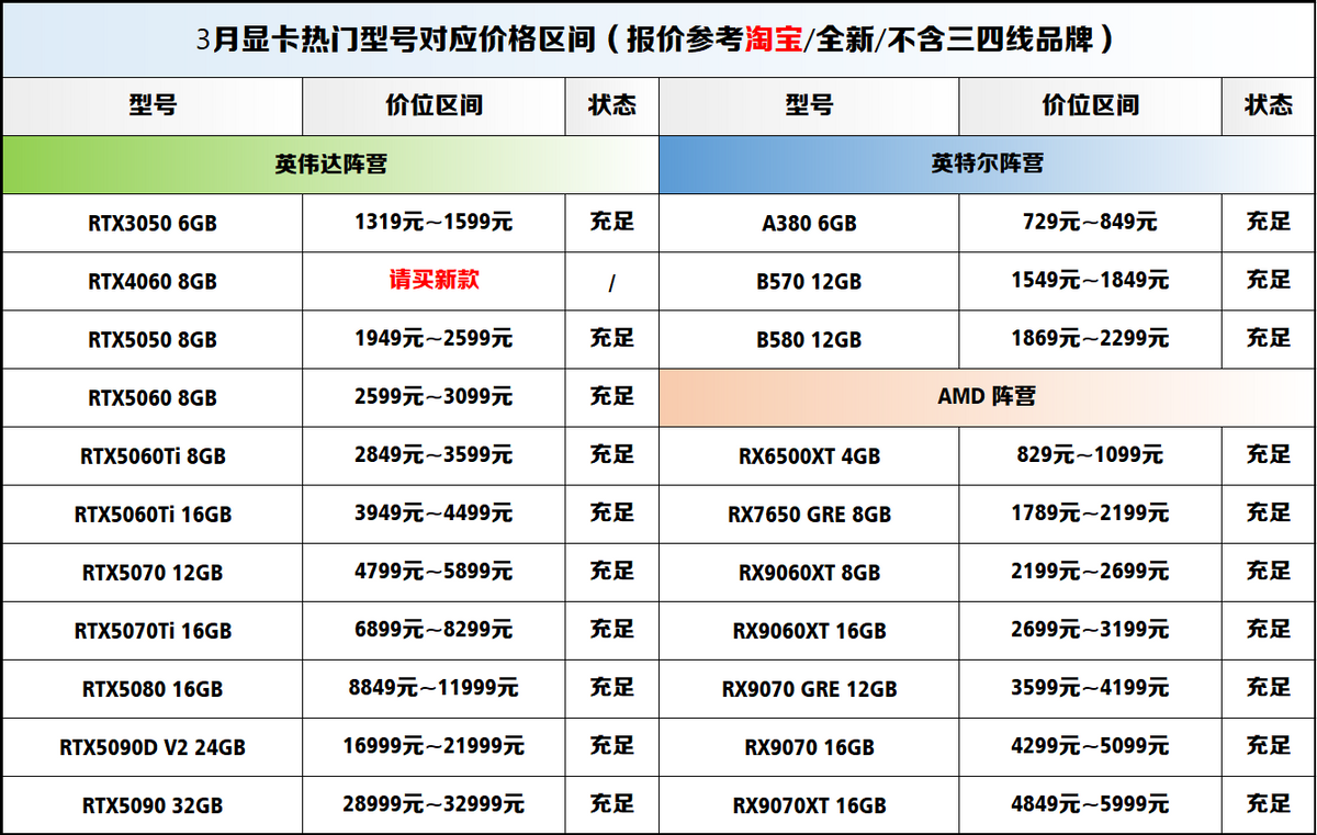 ☞ 英伟达RTX5060Ti同样有8GB显存和16GB显存两种版本,其中8GB版本一直没涨价,便宜的也就2800-3000元,个人感觉性价比很合适,但16GB基本都在4000元附近,所以现阶段两者的差价已经拉大到800-1000元。RTX5070、RTX5070Ti、RTX5080等高端型号直接按照预算来选,具体也没啥可建议的。