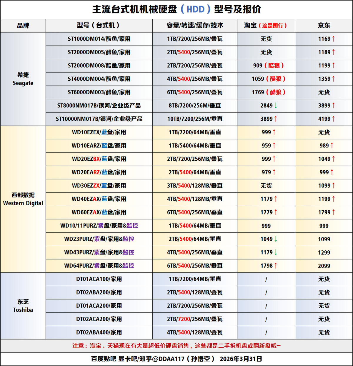 【上图】机械硬盘在过去一个月价格继续大涨,且多数型号直接无货可买,如果真要买全新机械硬盘还是建议4TB起步,4TB和6TB相对划算,小容量产品真就“大冤种”。机械硬盘选择方面,现在针对日常家用的产品线基本就是西部数据蓝盘/紫盘、希捷酷鱼或者东芝DT01/02系列,随便买就行,紫盘、酷狼等监控盘、银河等企业级硬盘也一样可以家用。例如现阶段希捷酷鱼价格高且缺货严重,你完全可以选择平替的酷狼系列,价格还更便宜。