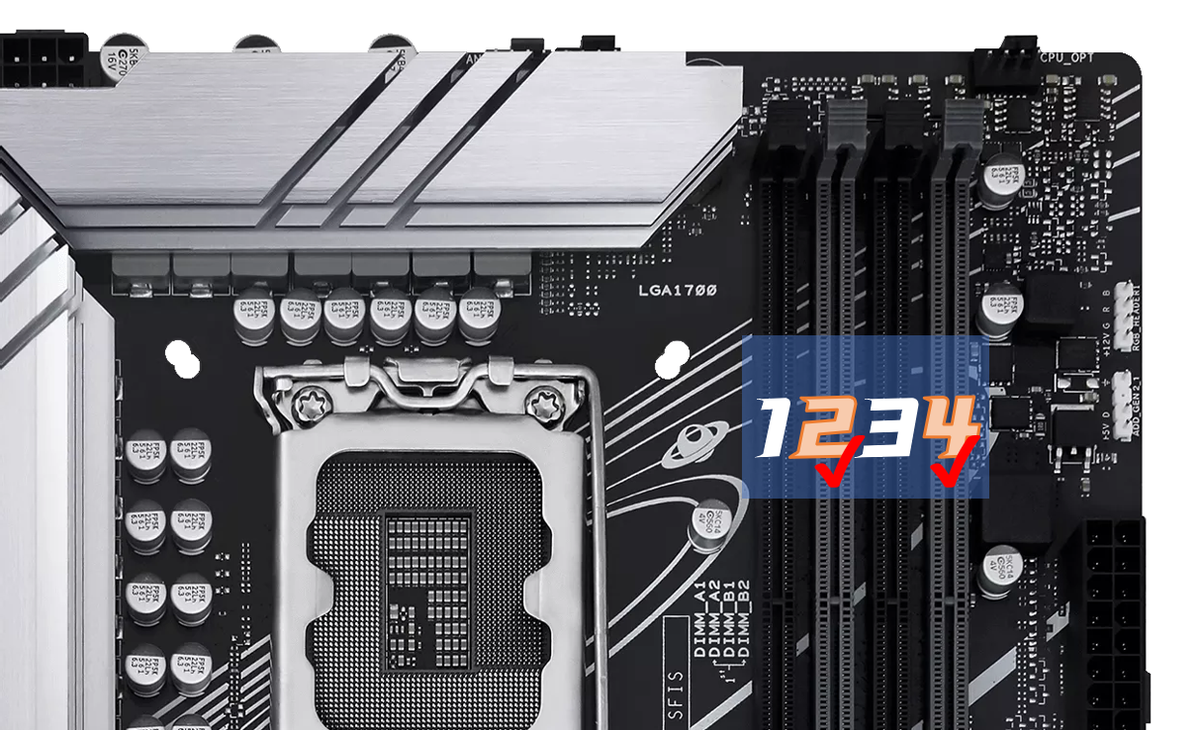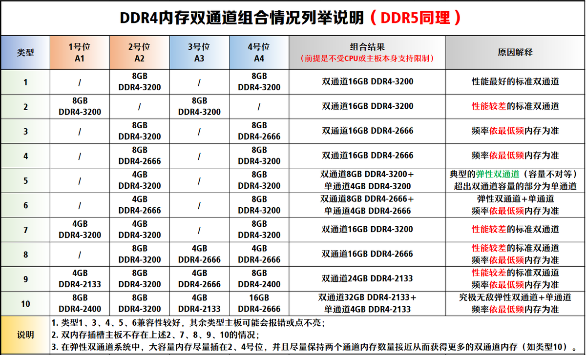 ★ 这里还需要注意,只有2根内存插槽的主板组双通道时,只要插满自然就是双通道了,如果是4根插槽的板子(1、2是一个通道,3、4是一个通道),插两根时,建议插1、3位置或者2、4位置(也就是间隔一个空位/以靠近CPU的第一根插槽位为1)来组成双通道,但一定是优先插2、4位,其次才是1、3位(如上图)。简单说,1、3位是2、4位的延伸,2、4位的性能更好。实际上插1、4位或插2、3位也能组双通道(因为它们也在两个不同的通道上),只是性能较差,有些主板会直接报错或点不亮。从上述案例我们也可以得知,有些低频小容量内存条可加可不加,他们对系统性能的提升并不一定是正向的。