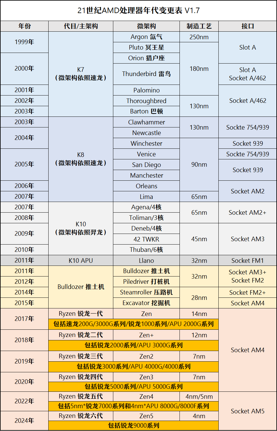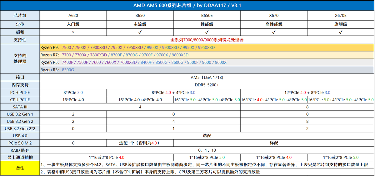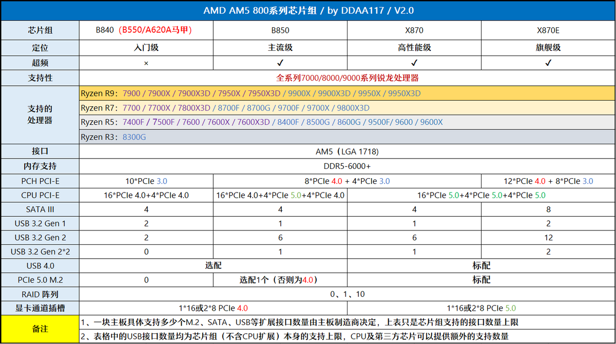 ☞ AMD基于AM5接口的7000/8000/9000系列锐龙仅支持DDR5内存,市售所有A620/B650/X670以及B840/B850/X870等主板均采用DDR5内存插槽,而之前几代基于AM4接口的锐龙则仅支持DDR4内存。