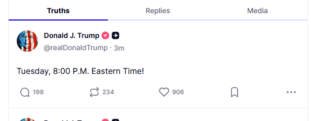美国总统特朗普在社交平台Truth Social发文称:美东时间周二(4月7日)晚上8点(北京时间周三上午8点)。