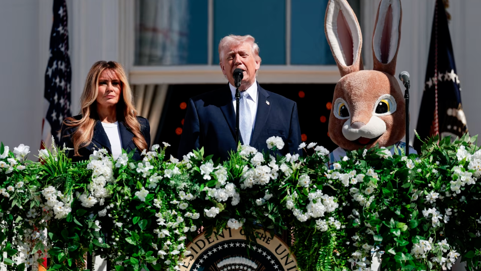特朗普和梅拉尼娅在白宫南草坪主持一年一度的复活节滚彩蛋活动时向人群发表讲话。