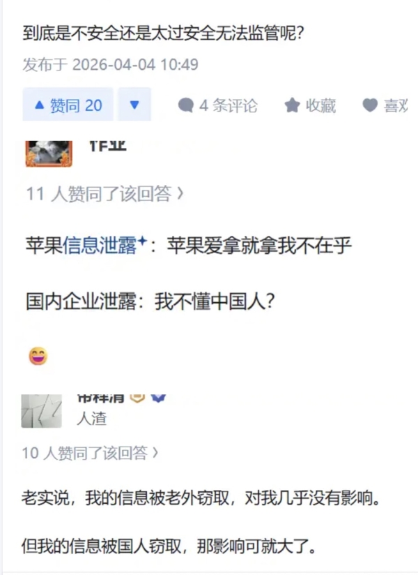 也有网友嘲讽,“到底是不安全还是太过安全无法监管呢?”“老实说,我的信息被老外窃取,对我几乎没有影响。但我的信息被国人窃取,那影响可就大了”“哪个不窃取啊,我们早就都是透明人,多一个也不在乎了。”