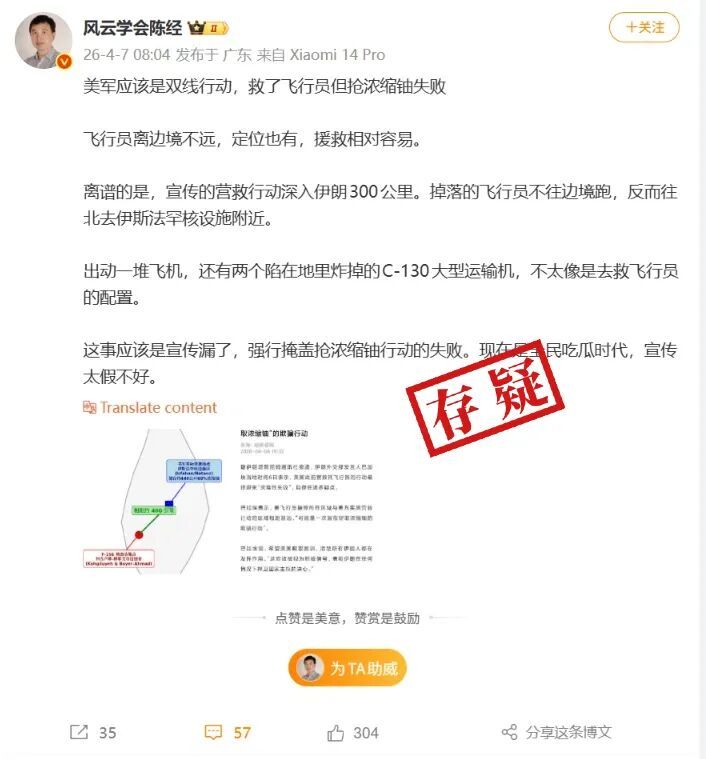 有网友对美军的救援行动提出质疑,认为所谓的救援行动实为“窃取浓缩铀的掩护行动”,理由是“美军宣称的飞行员坠机地点与实际军事行动地点相距约400公里”,而最终行动的地点“距离伊斯法罕核相关设施仅数英里”。