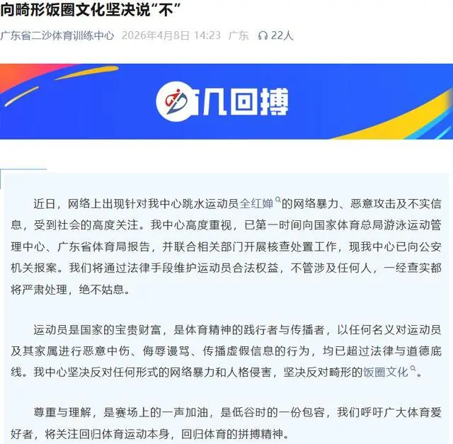 4月8日,全红禅所属的广东省二沙体育训练中心发文表示,近日,网络上出现针对该中心跳水运动员全红婵的网络暴力、恶意攻击及不实信息,受到社会的高度关注。文中提到,该中心已第一时间向国家体育总局游泳运动管理中心、广东省体育局报告,并联合相关部门开展核查处置工作,已向公安机关报案。