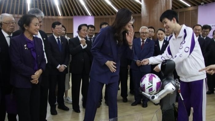 在具身智能实验室,机器人邀请郑丽文给足球签名。郑丽文表示,想把机器人带回家。此外,郑丽文还参访了工程教育实验室、AI未来教室等,并戴上VR虚拟实境装置体验了清华附中的AI教育课程。