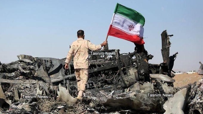 4月6日,伊朗士兵在美军战机残骸前竖起伊朗国旗 伊朗媒体