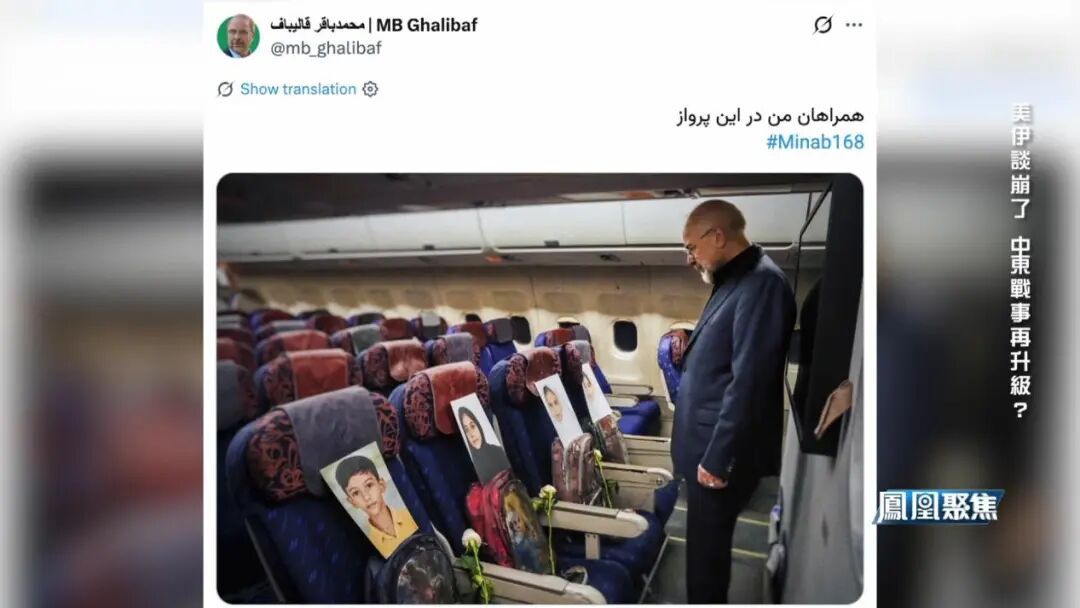 出发当天,本次伊朗谈判代表团由伊斯兰议会议长卡利巴夫,在社交媒体上发布了一张特别的照片,配文写道:我的飞行同伴们。画面中,一身正装的他默默注视着前排座位,座位上摆放着四名儿童的照片和书包。2月28日,在美以对伊朗发动军事行动的首日,伊朗米纳卜市的一所小学遭遇空袭,至少168名儿童遇难。正因如此,伊朗将这支谈判团队命名为“米纳卜168”。