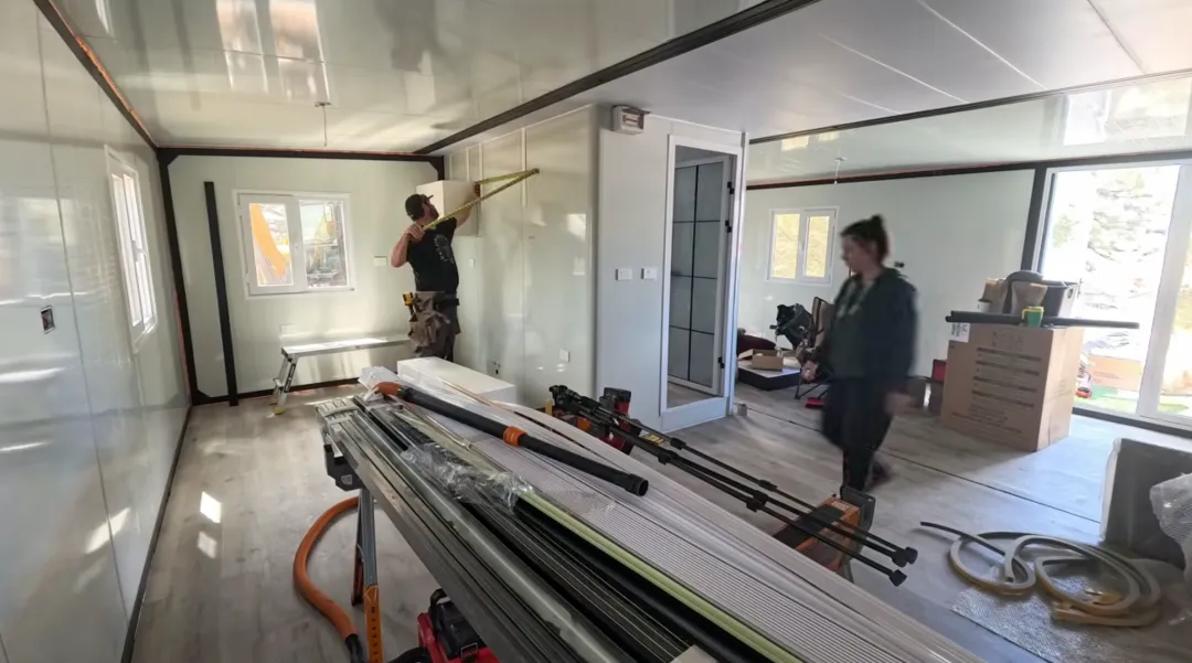 回头看Shelly那条视频。她在展开后的房子里逐项检查:金属仿木纹内墙带泡沫保温层、黑色铝合金窗框、密封很好的窗户、预装的煤气灶和热水器接口。“我们选了升级保温层的版本,”她说,“做工比我预想的要好。”