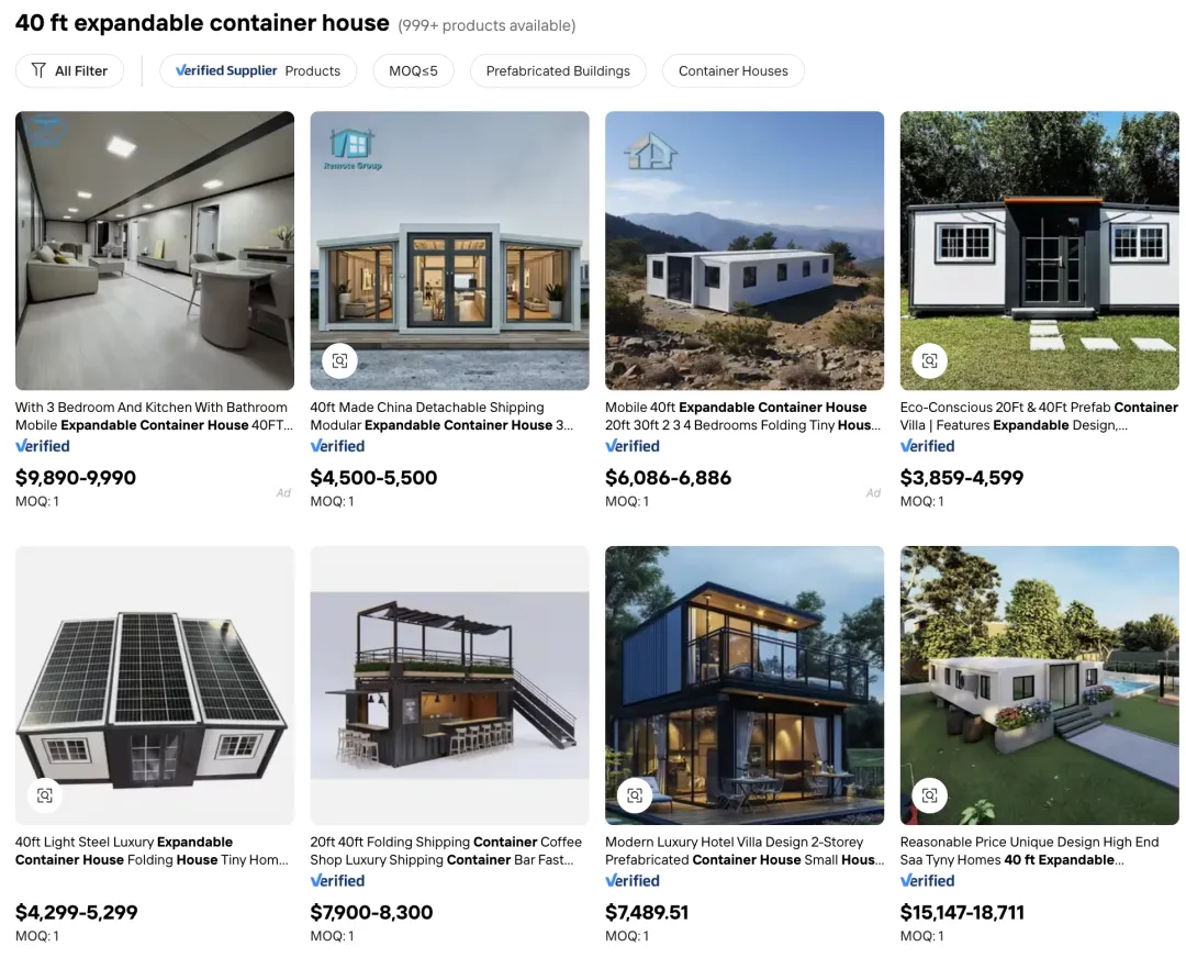 阿里国际站的数据也印证了这一点:prefab house、container home、tiny house,已经是平台上搜索量飙升最快的品类之一。北美中产和B端采购商,真的在网上把几吨重的房屋加进了购物车。