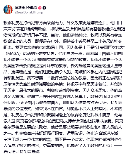 这可把特朗普气坏了。他一口气在Truth Social上发了一篇小作文,火力全开。他大骂教皇利奥十四世“在犯罪问题上软弱”“外交政策糟透了”,还声称“我不希望教皇批评美国总统”。