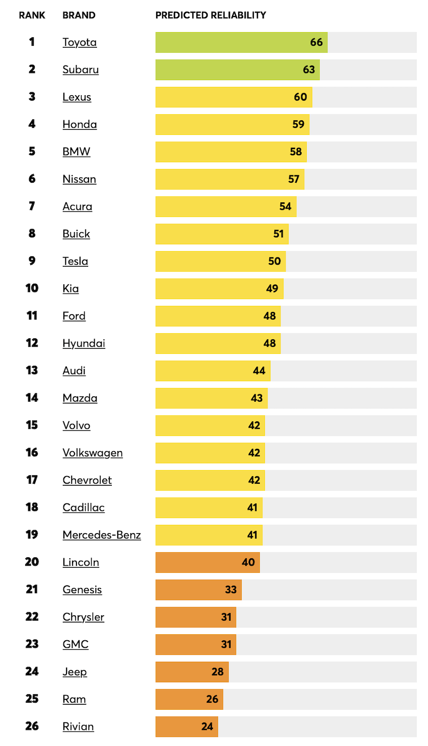 《消费者报告》年度可靠性调查,涵盖约38 万辆汽车的调查资料,包含一部分2026 年式车型,Toyota 名列第一,Subaru 排名第二,Lexus 第三,Honda 第四,BMW 位居第五。