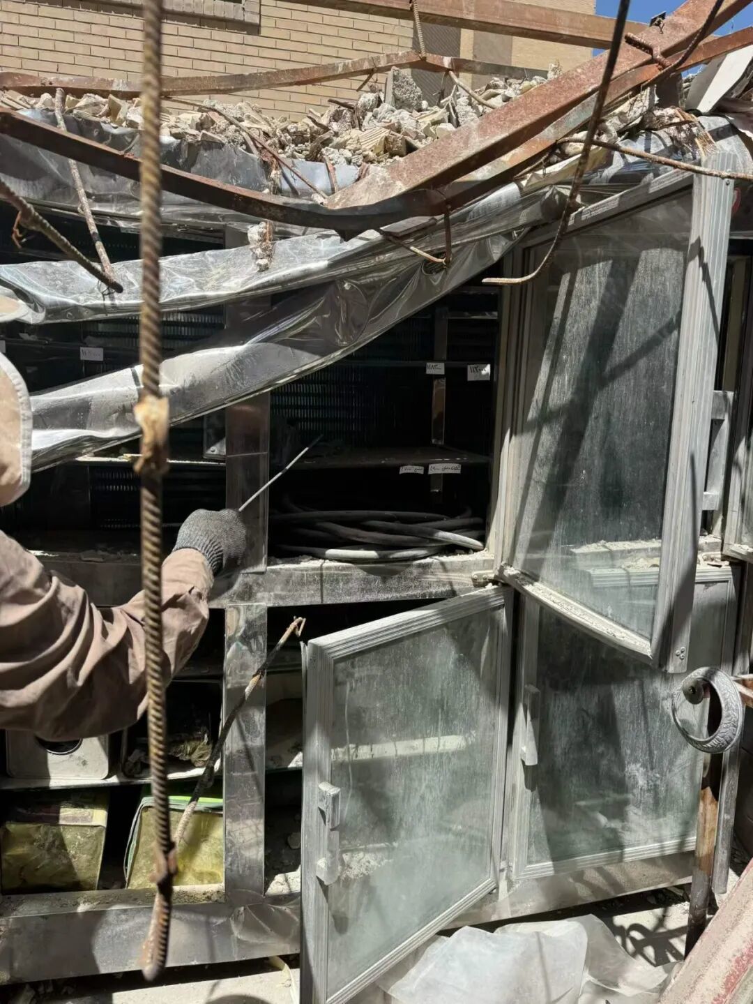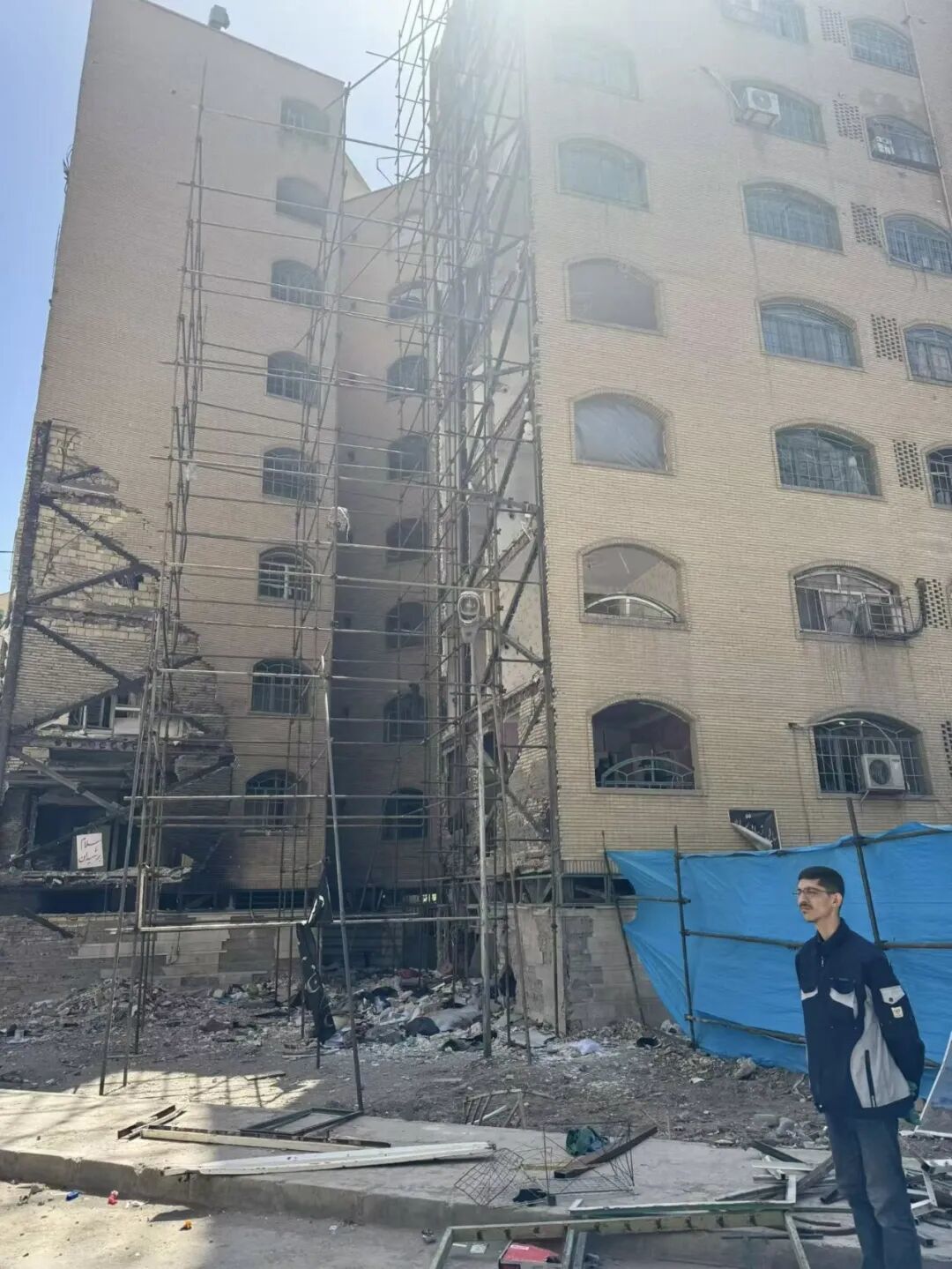 其中一个中年男人告诉我,他是德黑兰第15区市政府的一位工作人员。他给我看了桌上一堆文件夹,告诉我,他们现在正在负责处理这一带受损居民的修缮工作。市政府这边已经设立了专门的登记和对接机制,给受损住户填写表格,统计损失情况。像抹灰、焊接、泥瓦工、木工这些基础维修,现在都在逐步展开,希望能尽快帮助居民把生活重新安顿下来。