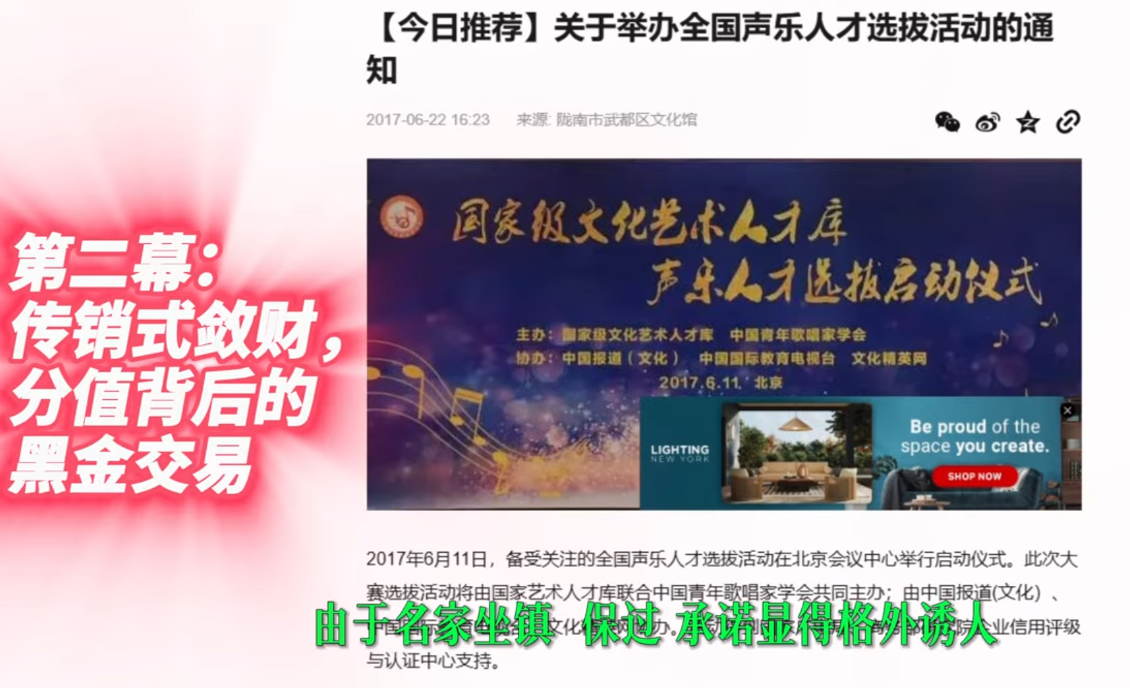 2017年,干儿子伙同舅舅在北京会议中心开启“声乐选拔”。舅舅亲发聘书,拉拢多位著名歌唱家、声乐教授站台背书,利用名家光环欺骗数万学生报名。 这场选拔实质是传销敛财:800元报名费被炒至80万,承诺“交钱保过”,由干儿子后台操控分值。赛后组委会失踪,学生退费竟遭威胁:“想不想拿毕业证!” 荒谬的是,面对实名举报,干儿子竟能“带罪晋升”副教授。当名家沦为骗局招牌,艺术净土何在? 下集预告:千万黑金流向何方?敬请关注!