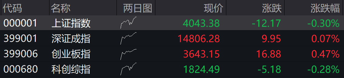 4月17日,A股四大指数开盘走势分化,沪指低开0.30%,深成指高开0.07%,创业板指高开0.47%,科创综指低开0.28%。