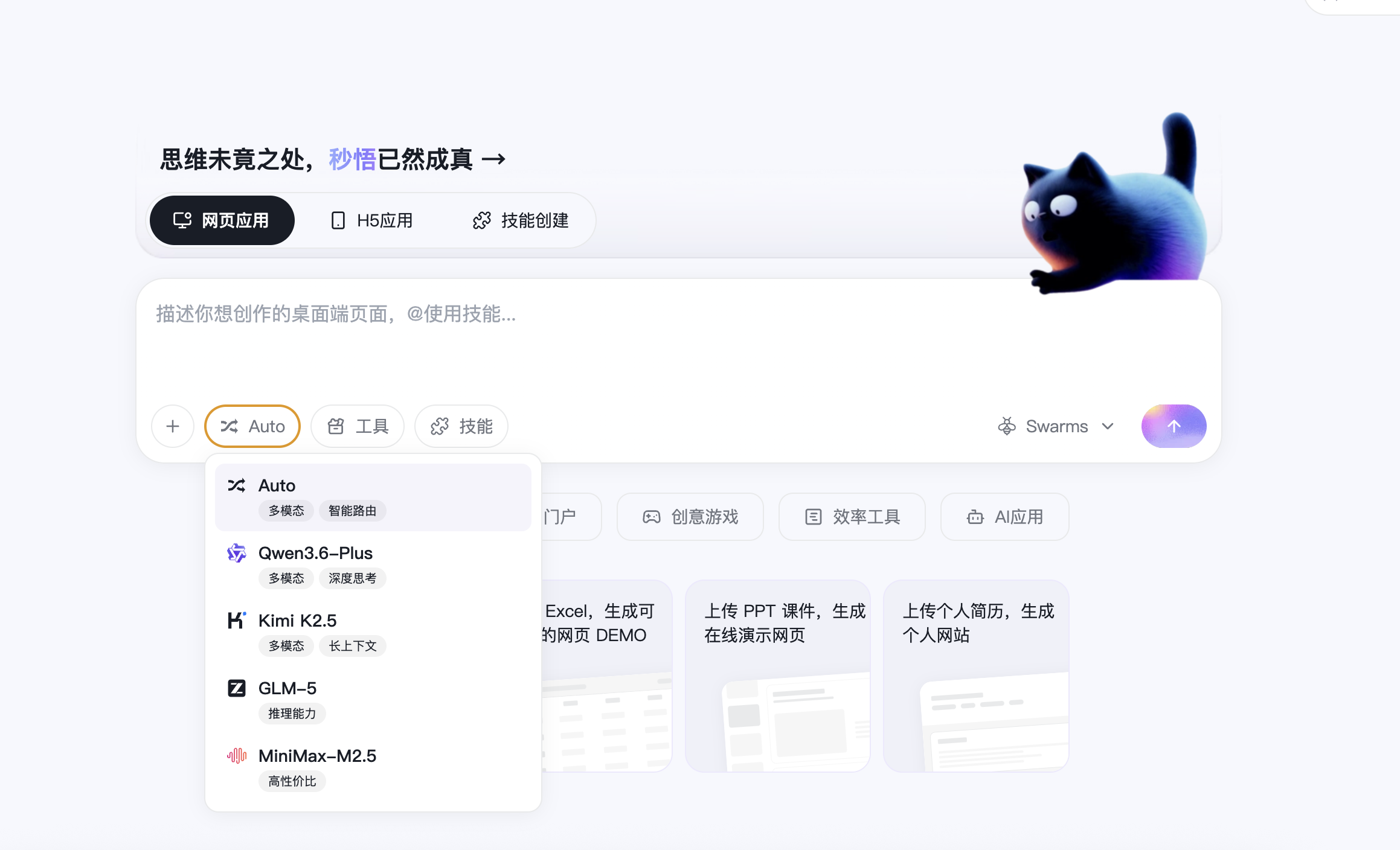 页面信息显示,Meoo在模型层集成了Qwen3.6-Plus、Kimi K2.5、GLM-5、MiniMax-M2.5大模型。用户可在页面选择网页应用、H5应用、技能创建等选项,自主选择对应的大模型或自动匹配模式,输入自然语言指令,Meoo就会自动进入对应的代码书写。