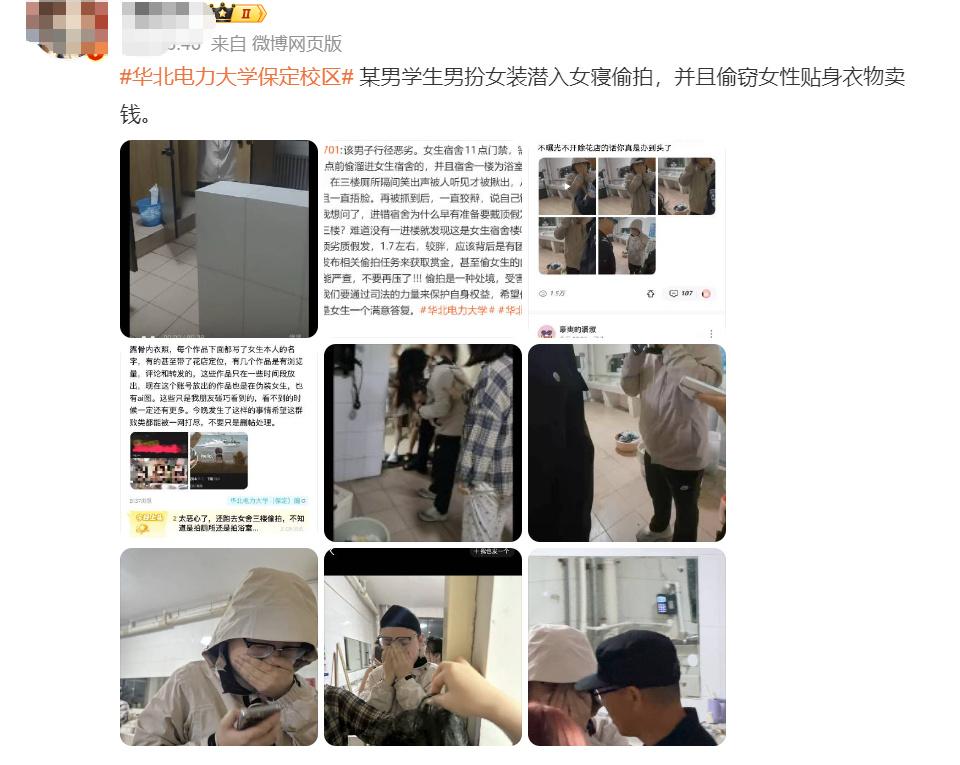4月24日,华北电力大学保定校区多名学生在社交平台发帖爆料,称该校一名男生戴假发潜入女生宿舍楼厕所,被当场抓住后,当地派出所已将其带走调查。