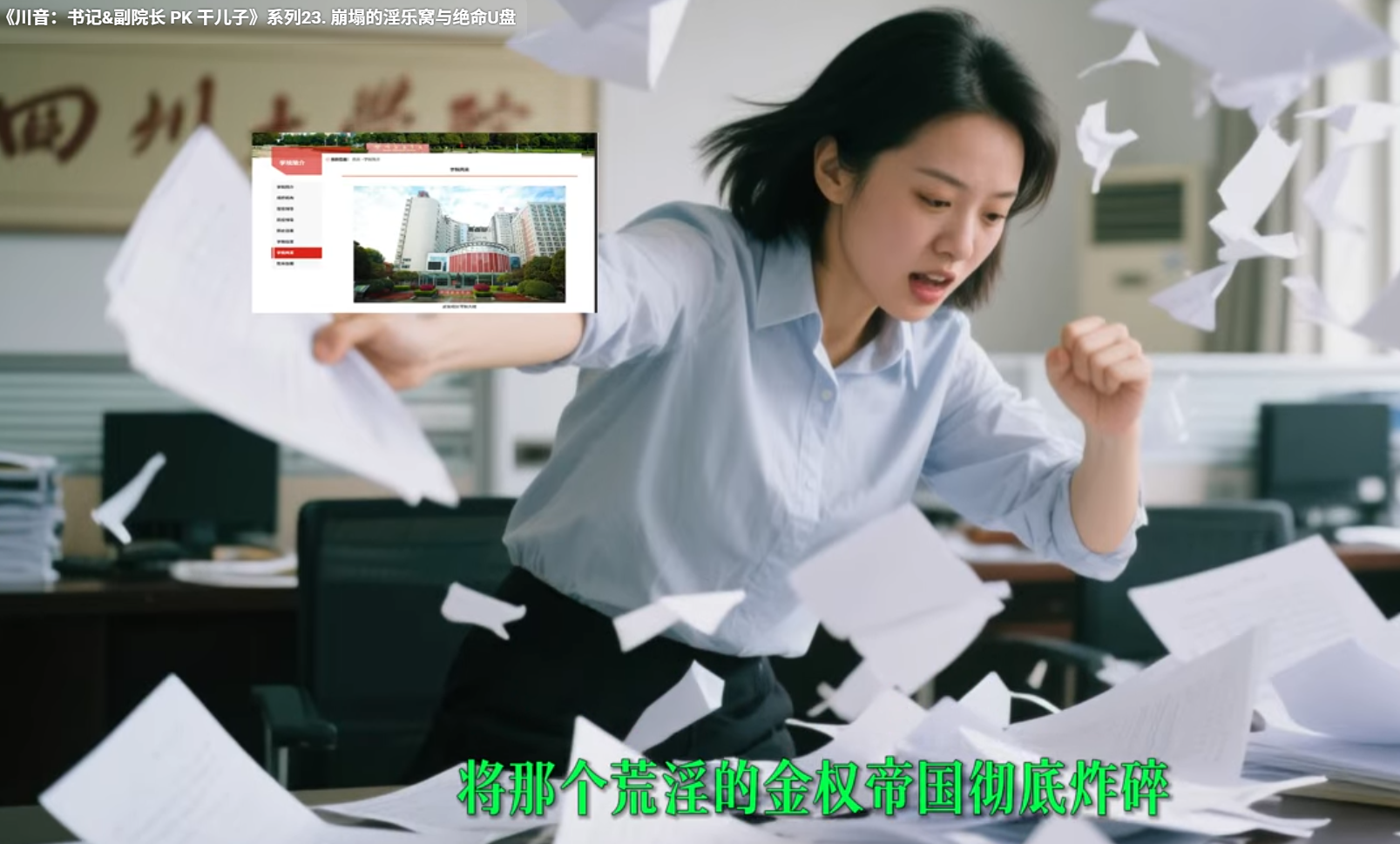 【0:00-1:05|反噬:绝命U盘曝光】 某教师预感将成替死鬼,疯狂发送“分赃记录”与“进贡名单”。昔日盟友瞬间反目,带血的证据将领导与情妇的荒淫帝国彻底炸碎。曾经站台的“砖家”在铁证面前纷纷现出骗子原形。 【1:05-2:00|清算:正义最后合围】 校门口怒火燎原,全国受害者手持山寨学会残招,高喊“严惩郭江滨,深挖柴与邓”。某教师潜逃被围,黑边眼镜滑落,露出惊恐原形。 结局: 贪婪算盘彻底粉碎,这场丑恶大戏在正义审判中迎来终局!毒瘤已割,川音重生! 下集精彩继续。