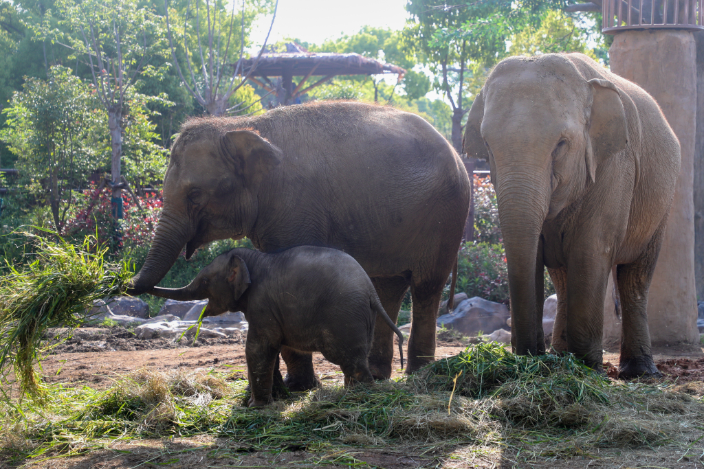 当天,亚洲象“格兰母子”与非洲象“露丝母女”也首次亮相。园方介绍,今年1月6日凌晨2点左右,亚洲象“格兰”顺利产下一头小公象。而“格兰”是位母性极好且经验丰富的妈妈,情绪稳定,温柔地护着象宝宝。转眼间,小象已快4月龄,活泼好动,最爱的事就是一头扎进草堆里翻滚玩耍。